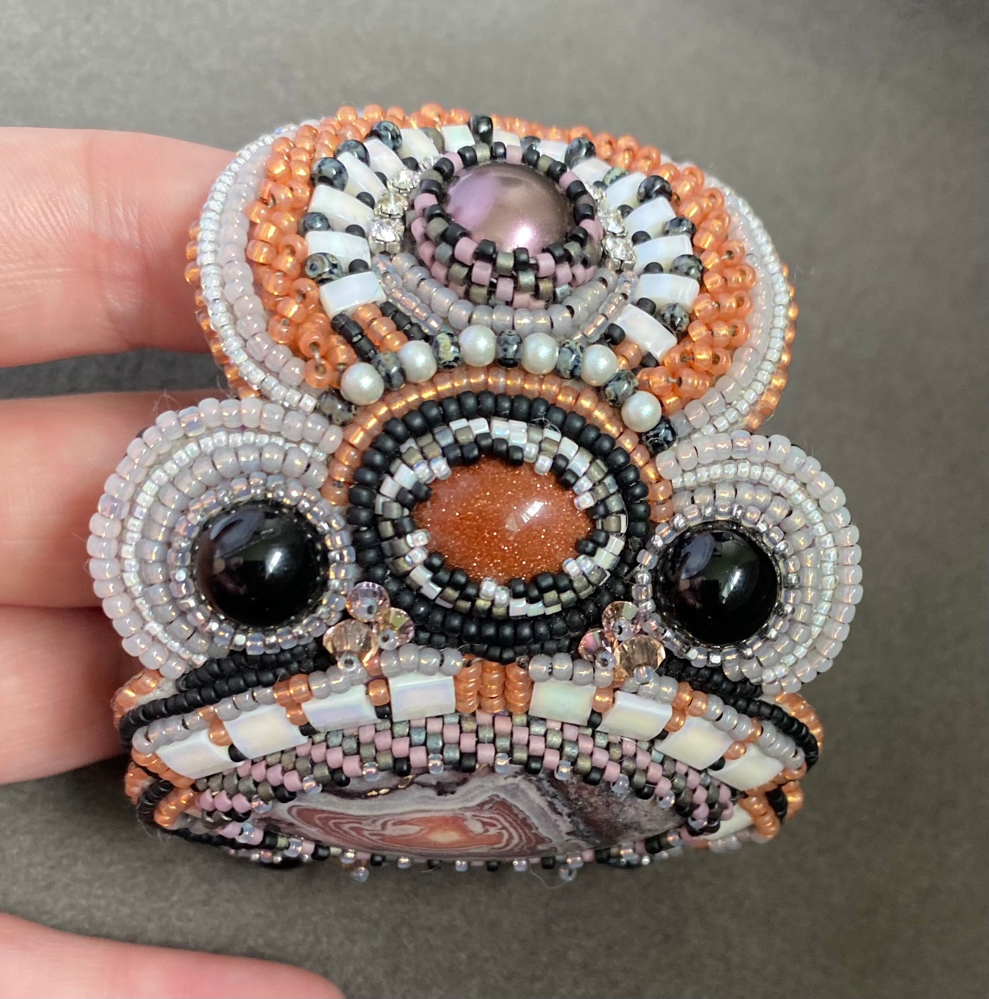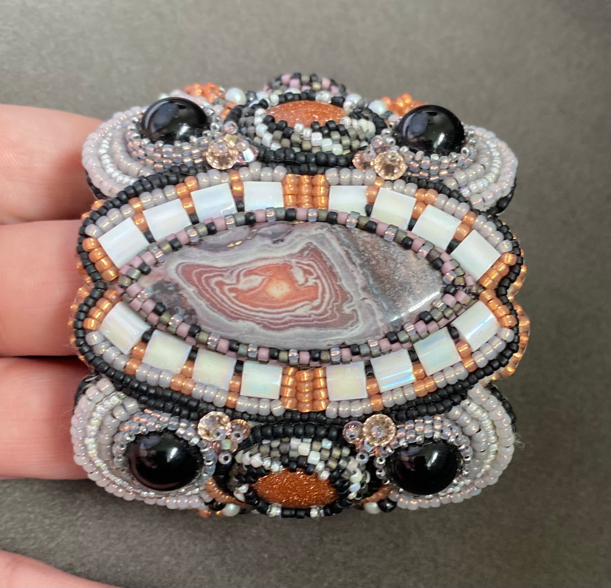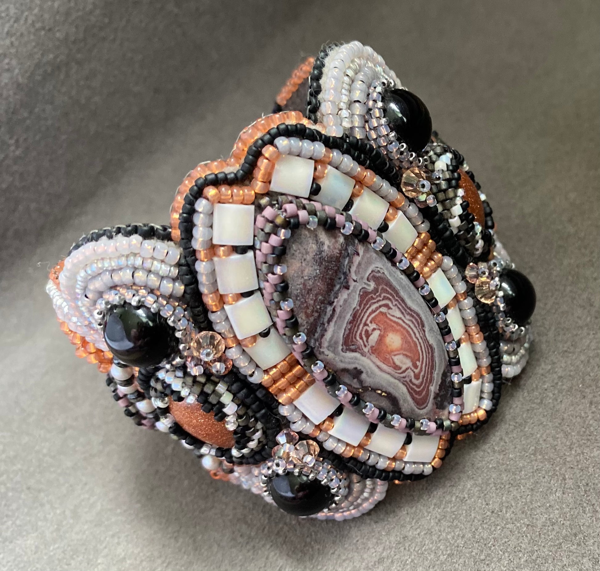 This is a Regina Payne design called Mountain Girl. It features goldstone cabs, crazy lace agate, and pearls all complimented with several styles of seed beads. The bracelet closes with a box clasp so it will not fall off. It is made to fit a 6.25-6.5” wrist.