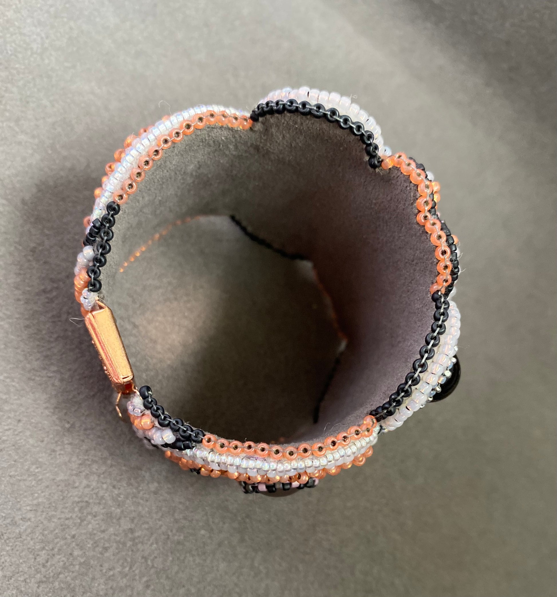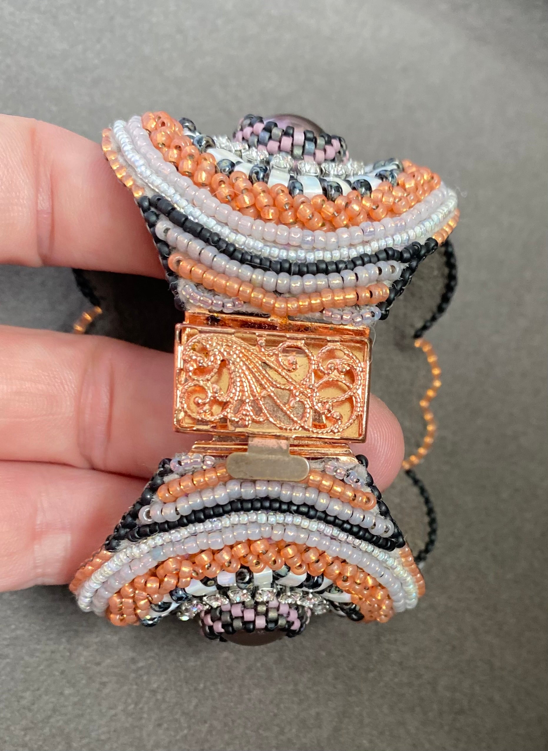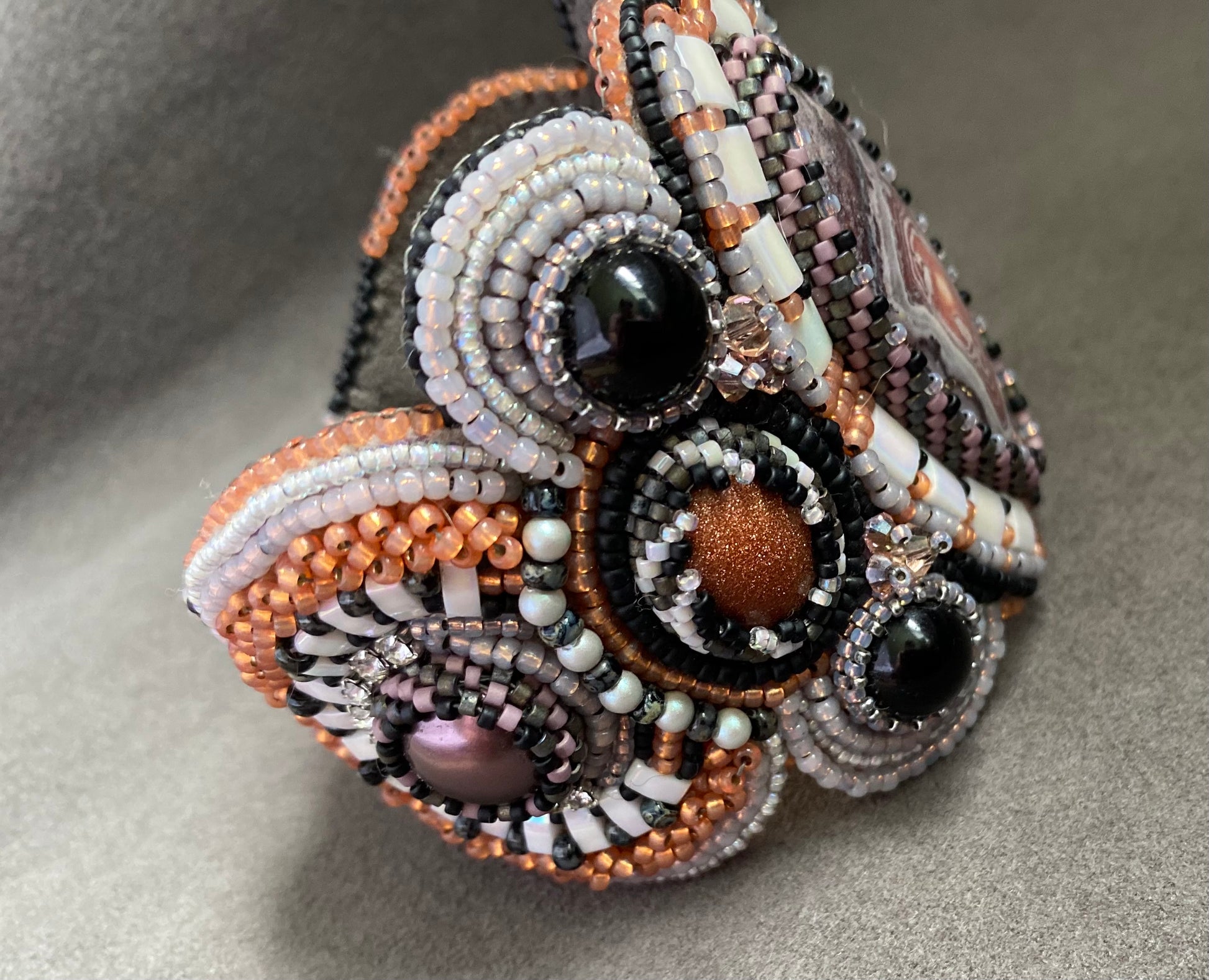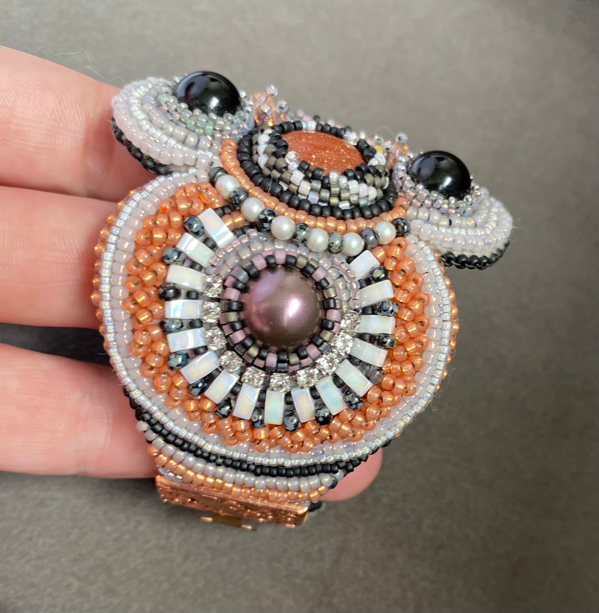 This is a Regina Payne design called Mountain Girl. It features goldstone cabs, crazy lace agate, and pearls all complimented with several styles of seed beads. The bracelet closes with a box clasp so it will not fall off. It is made to fit a 6.25-6.5” wrist.