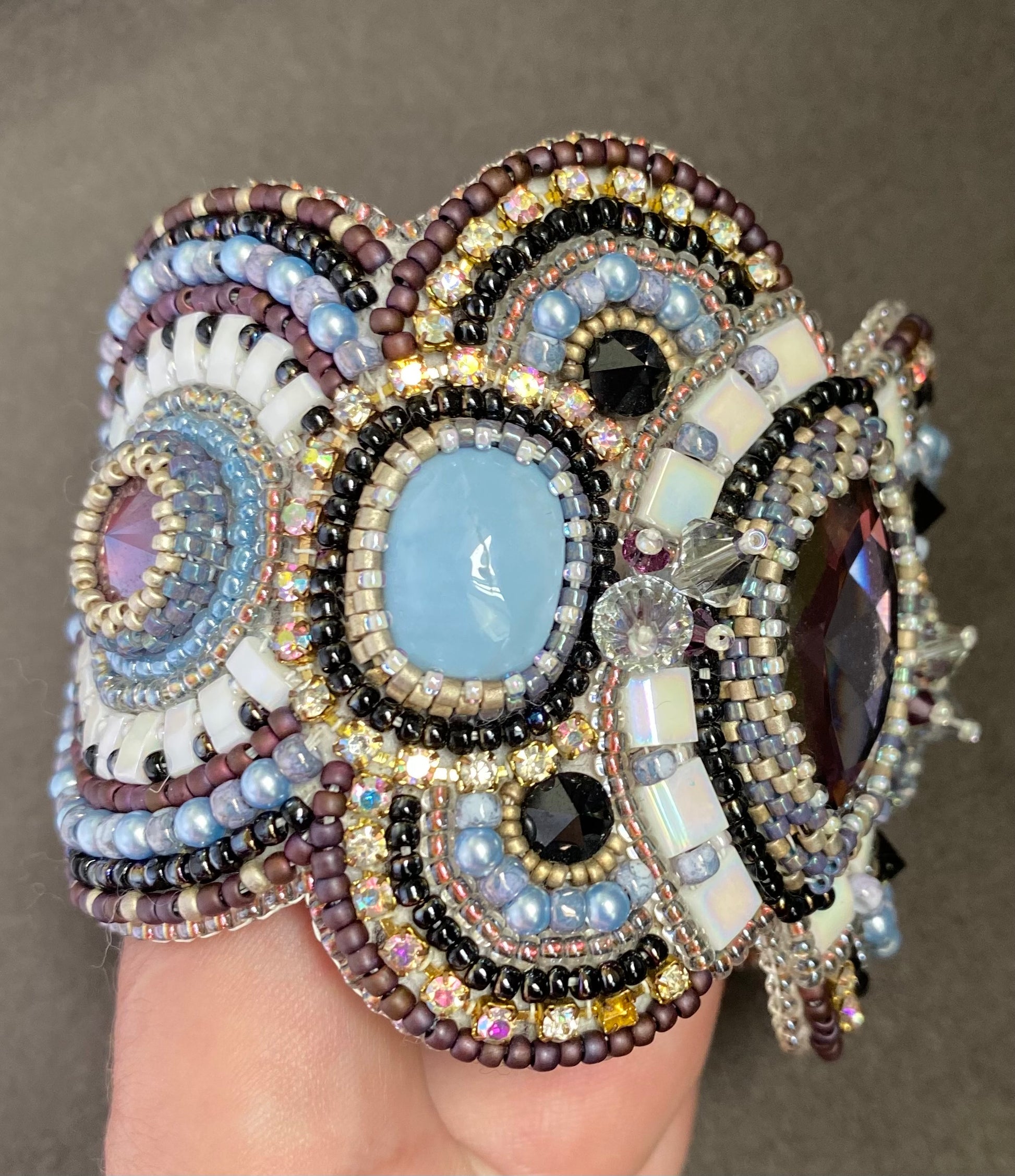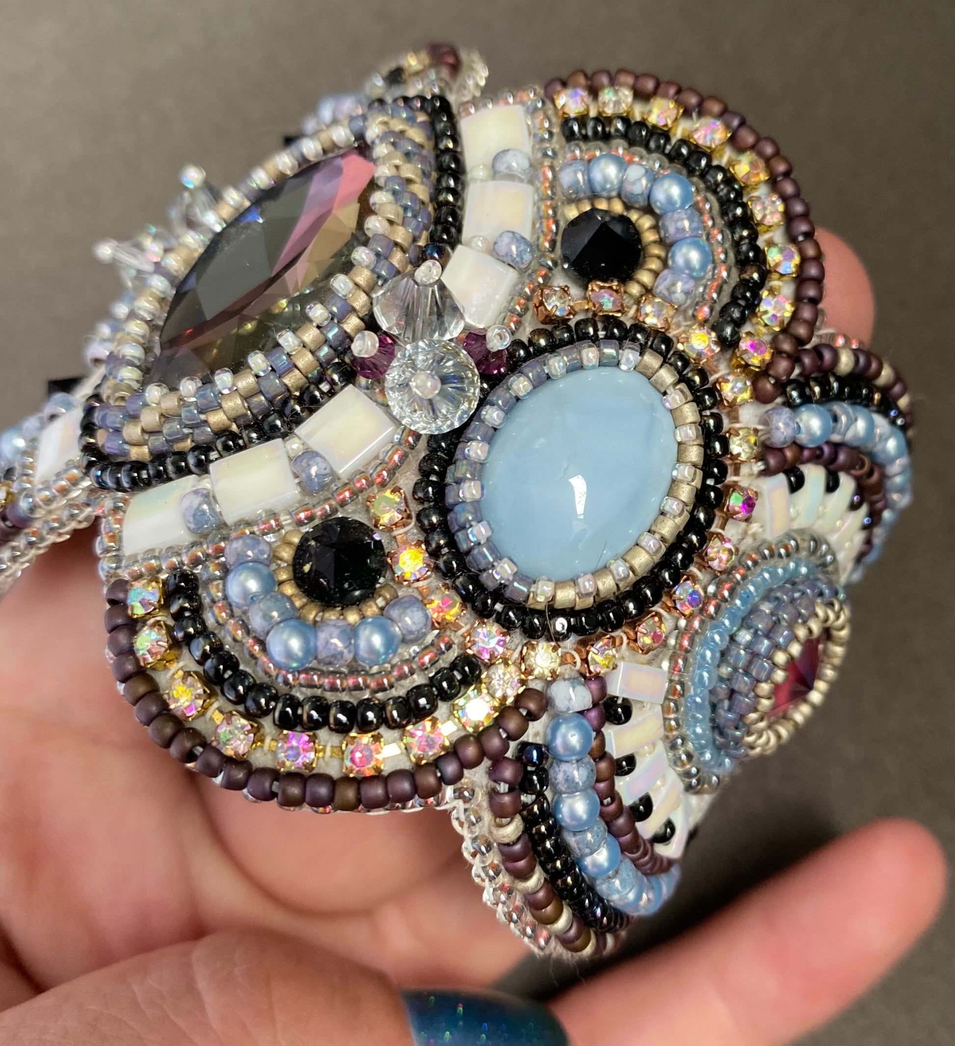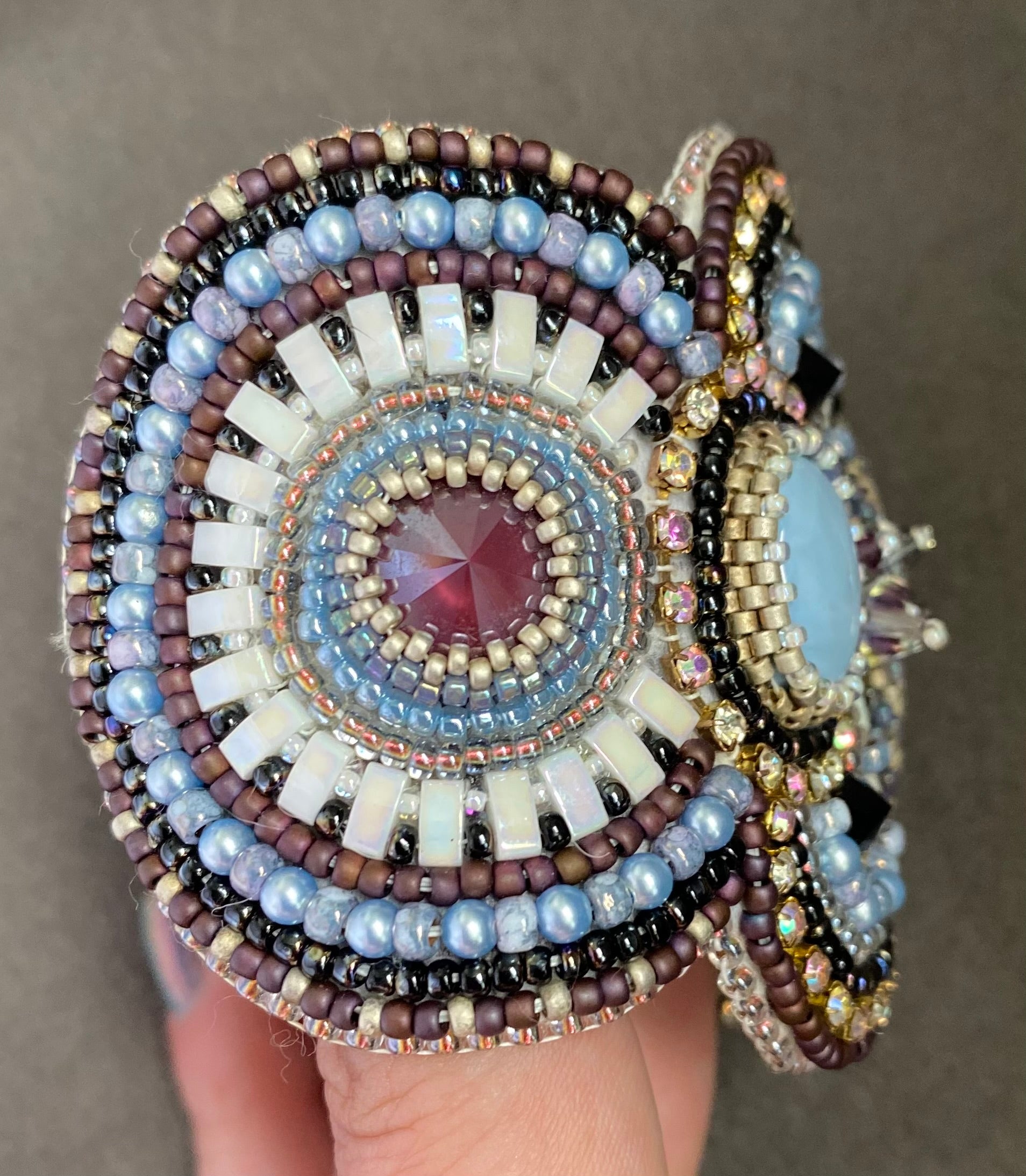 This is a Regina Payne design called Mountain Girl. This one has a crystal focal complimented with larimar cabochons and more crystals. The cupchain really sets this piece off adding so much sparkle, then it’s tamed back down with the pale blue and dark red accents. This has been beaded onto a metal cuff and line with white leather so it can be shaped to fit any size wrist.