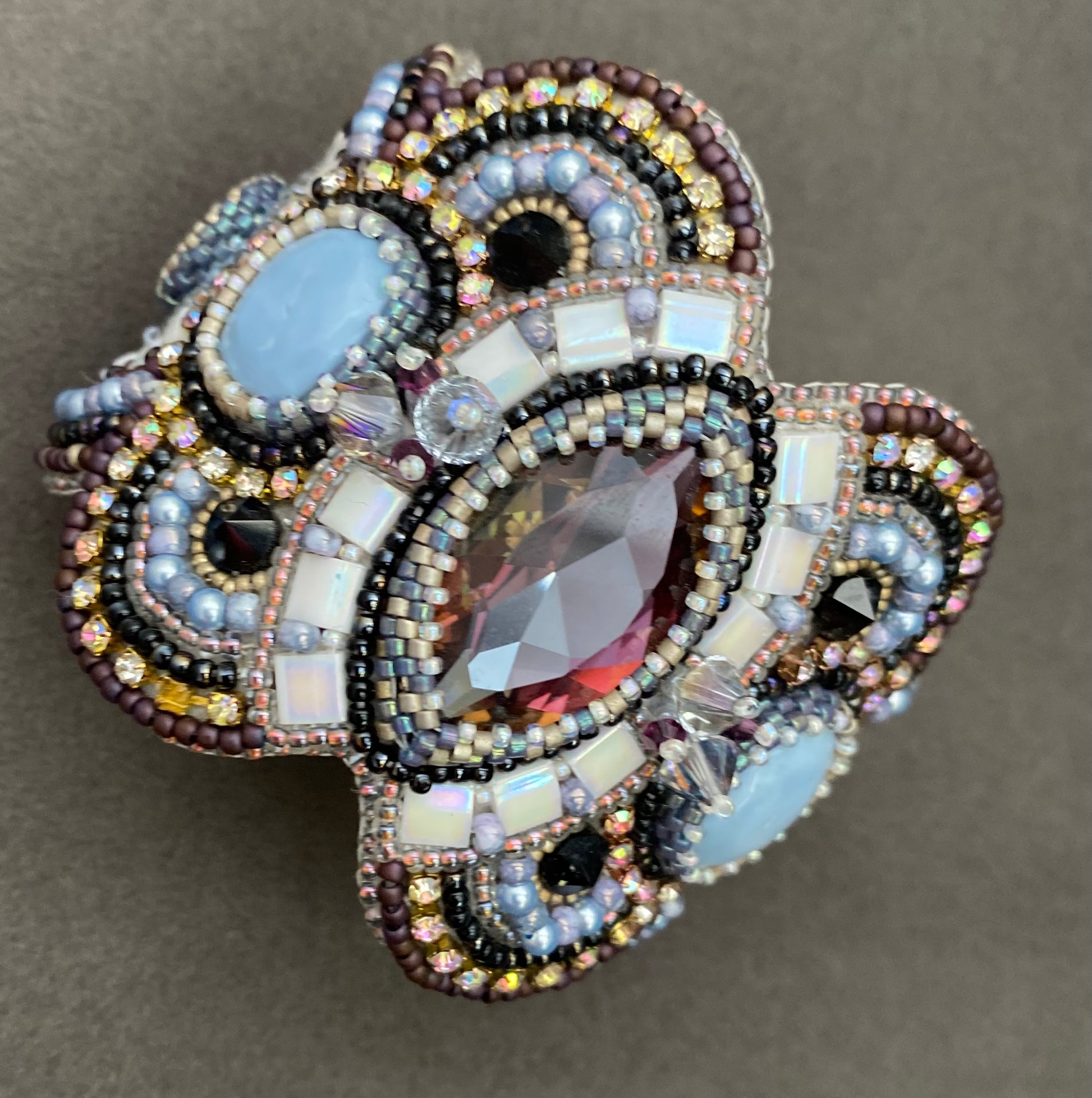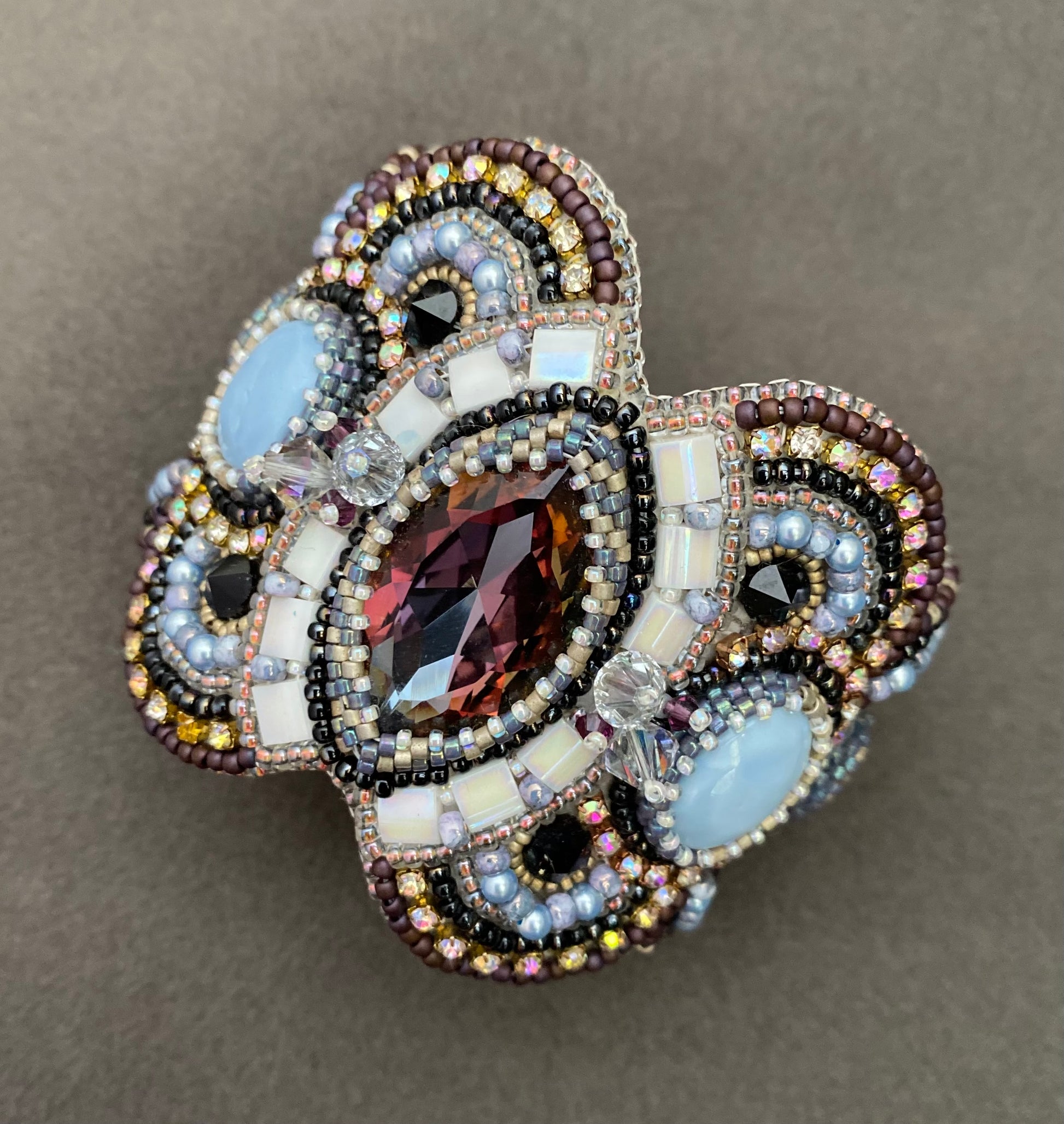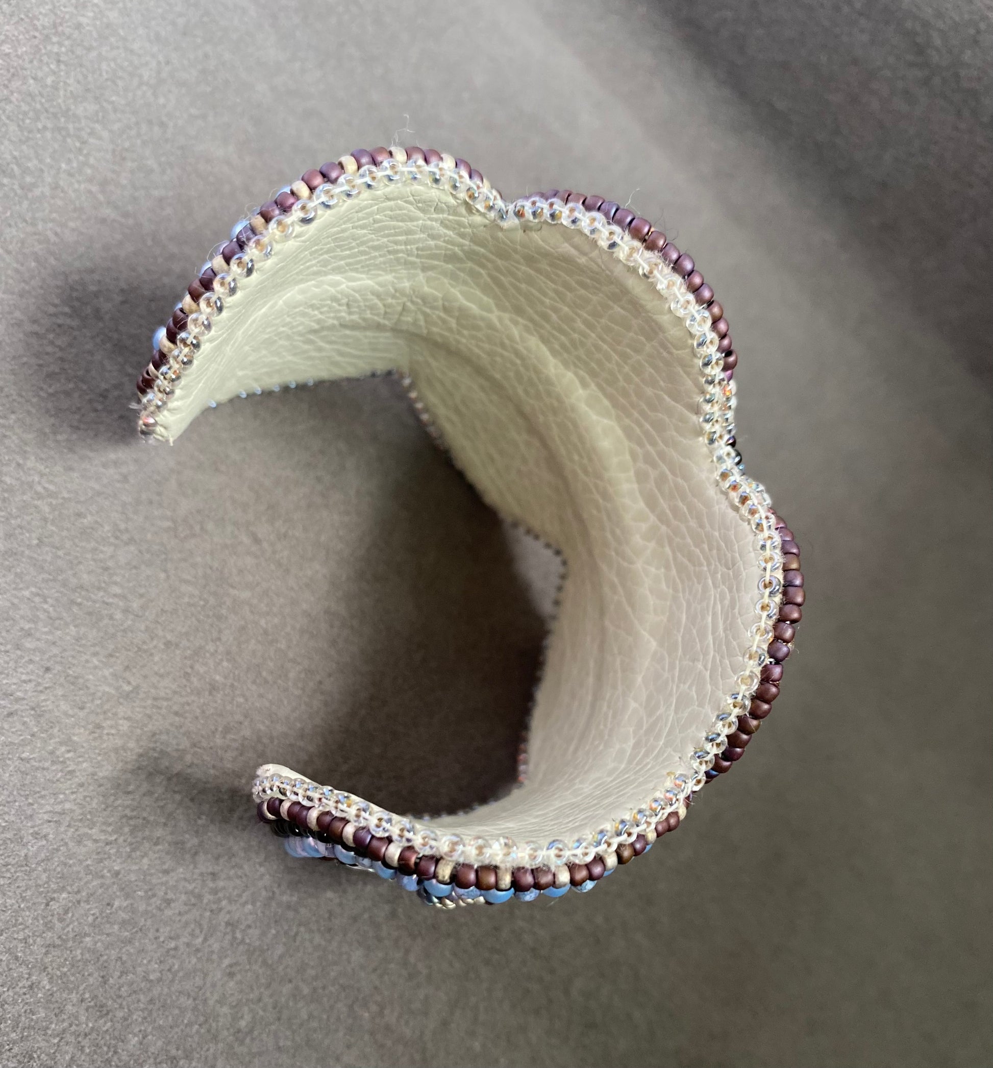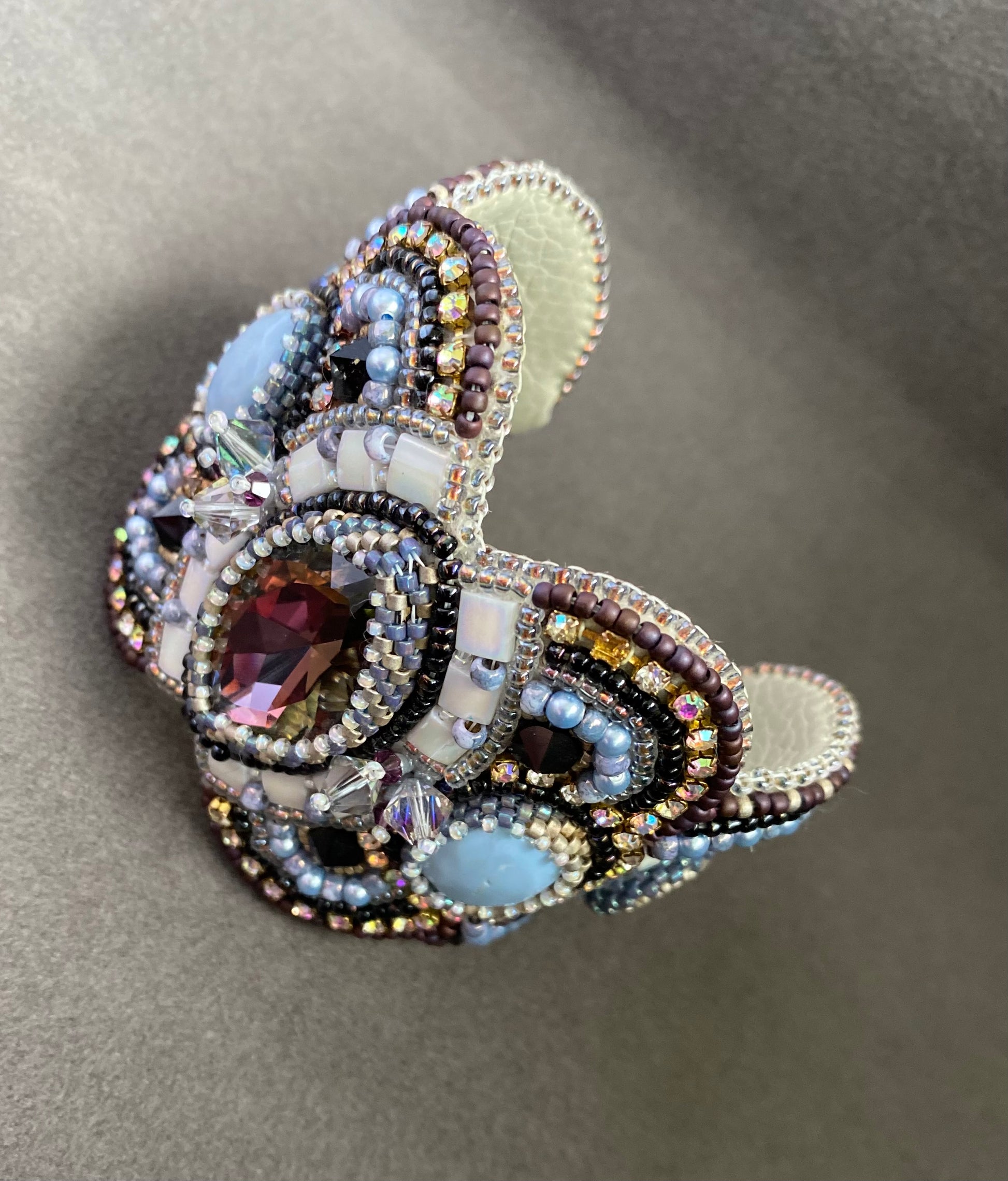 This is a Regina Payne design called Mountain Girl. This one has a crystal focal complimented with larimar cabochons and more crystals. The cupchain really sets this piece off adding so much sparkle, then it’s tamed back down with the pale blue and dark red accents. This has been beaded onto a metal cuff and line with white leather so it can be shaped to fit any size wrist.