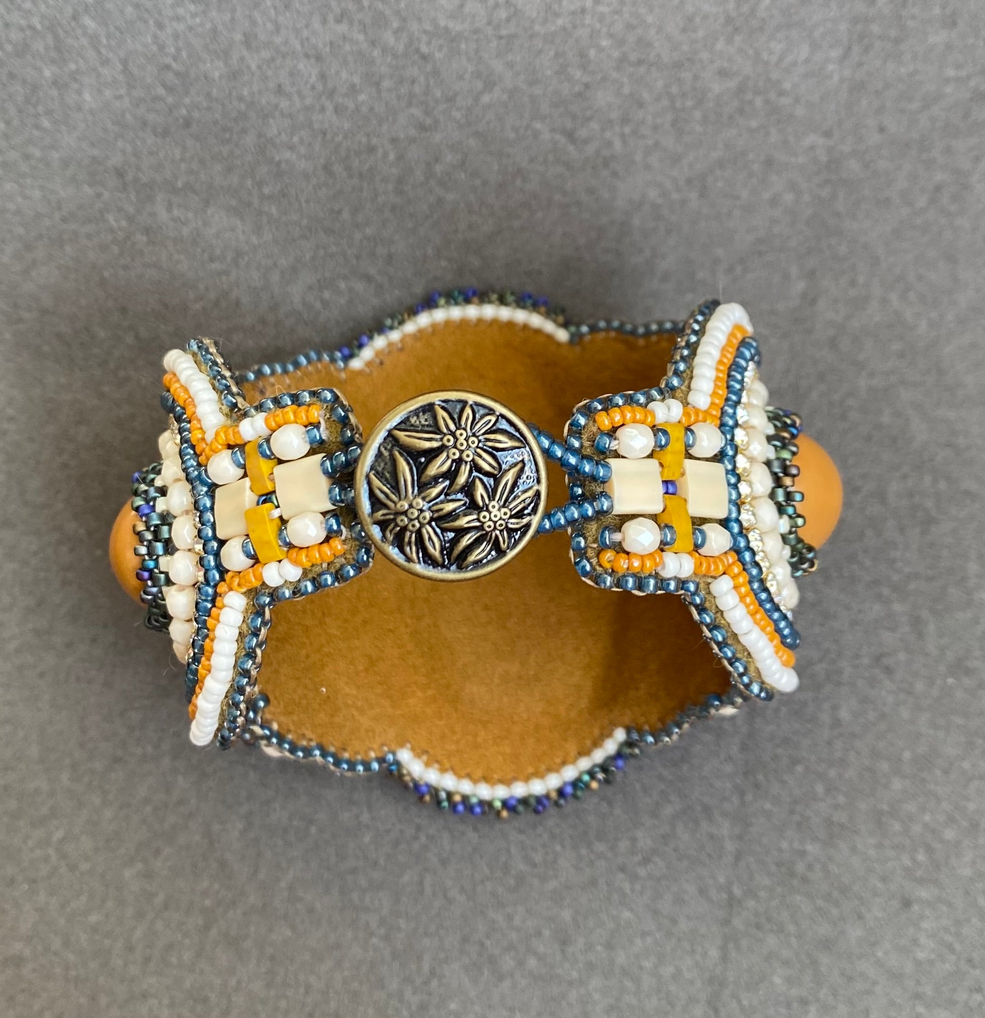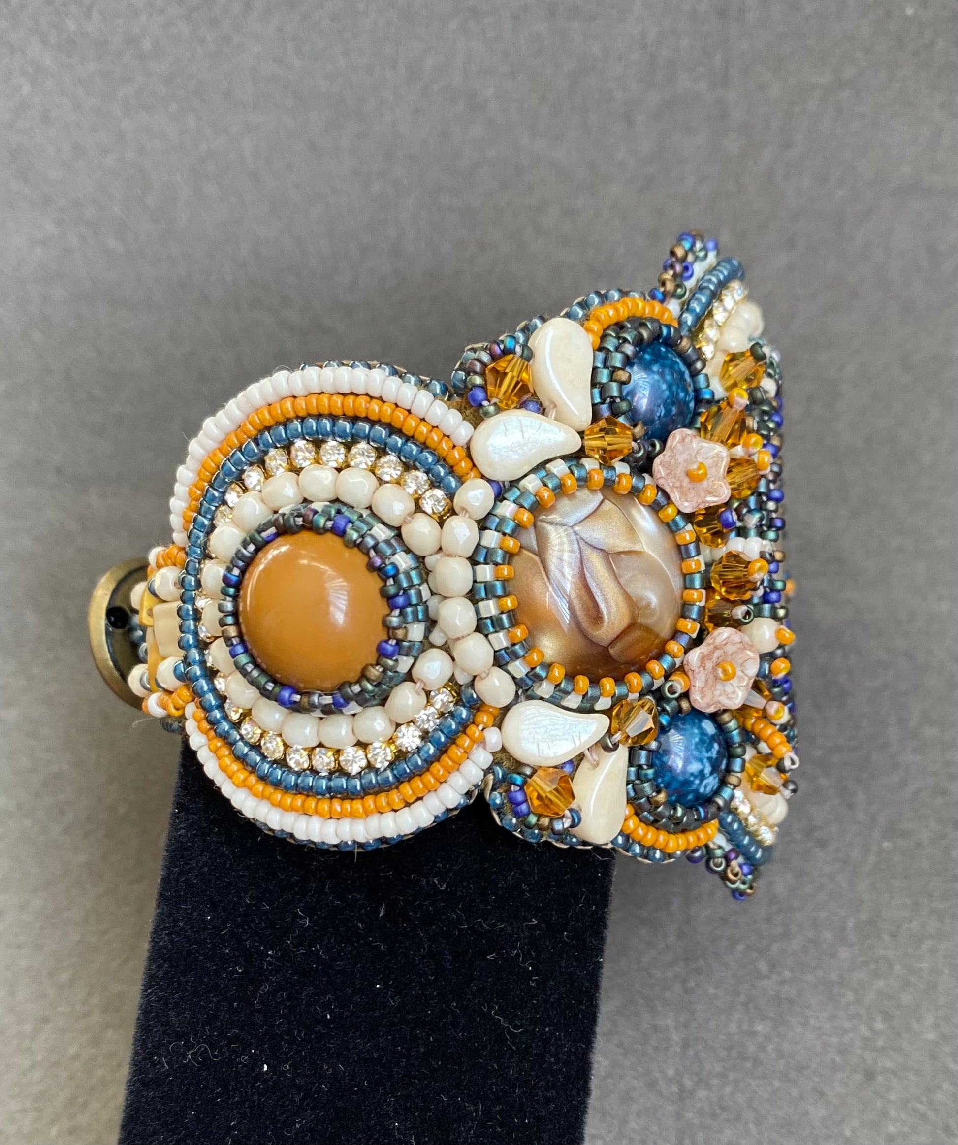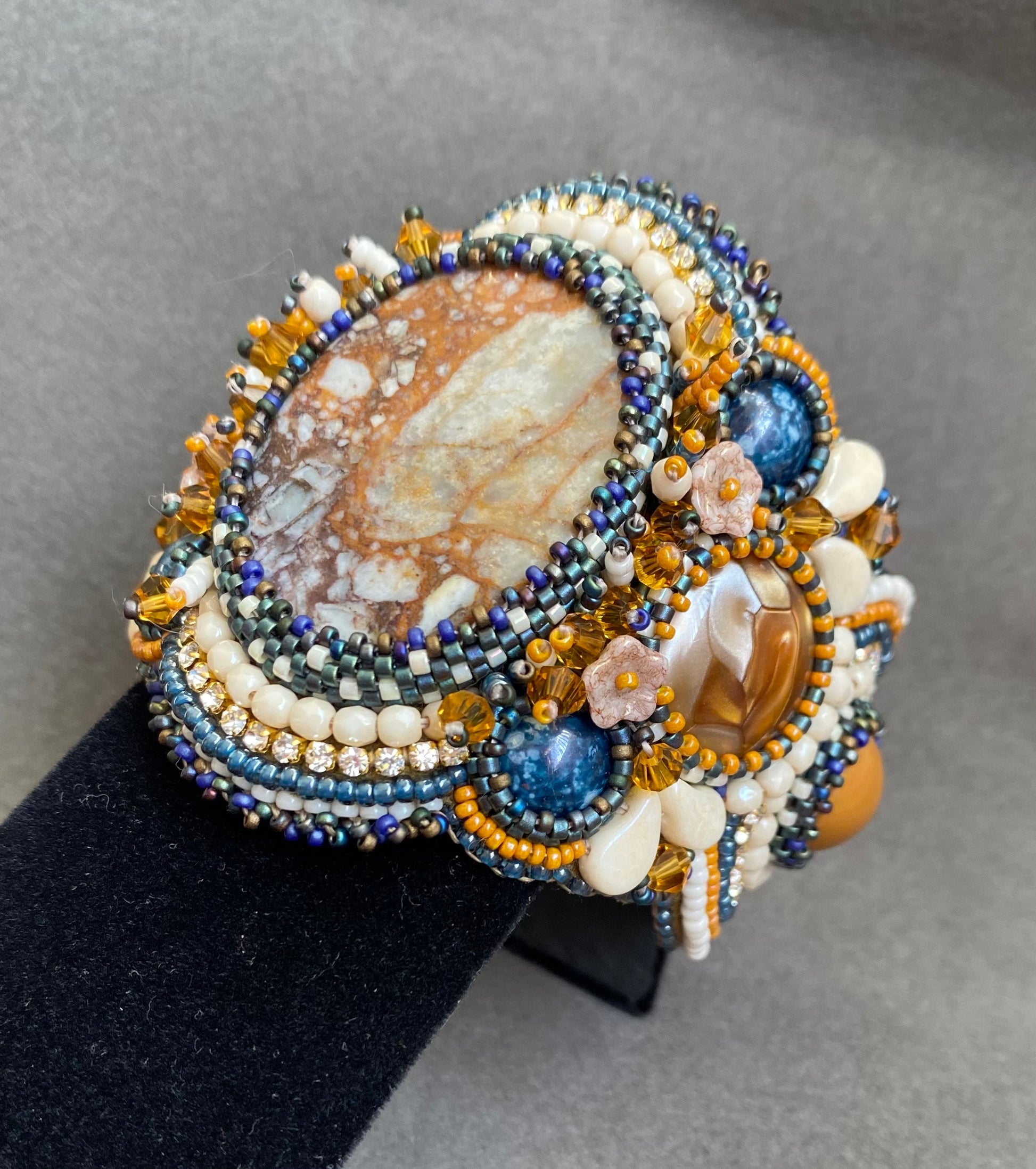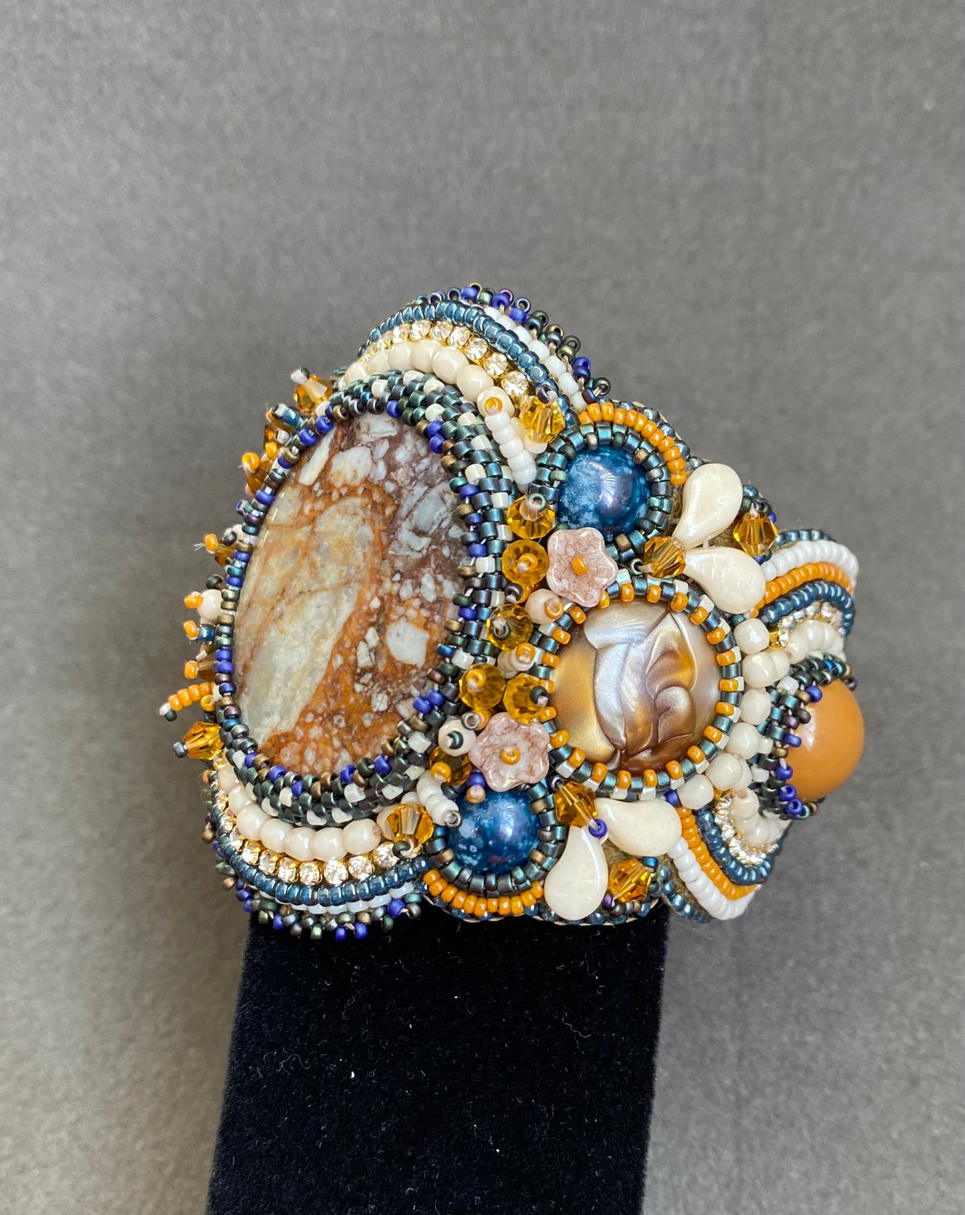 This bracelet is a Regina Payne design called Florida Sunshine. This one features seed beads, Czech beads, and crystal. The focal stone is Red Creek Jasper. The bracelet will fit a 6.5” wrist.