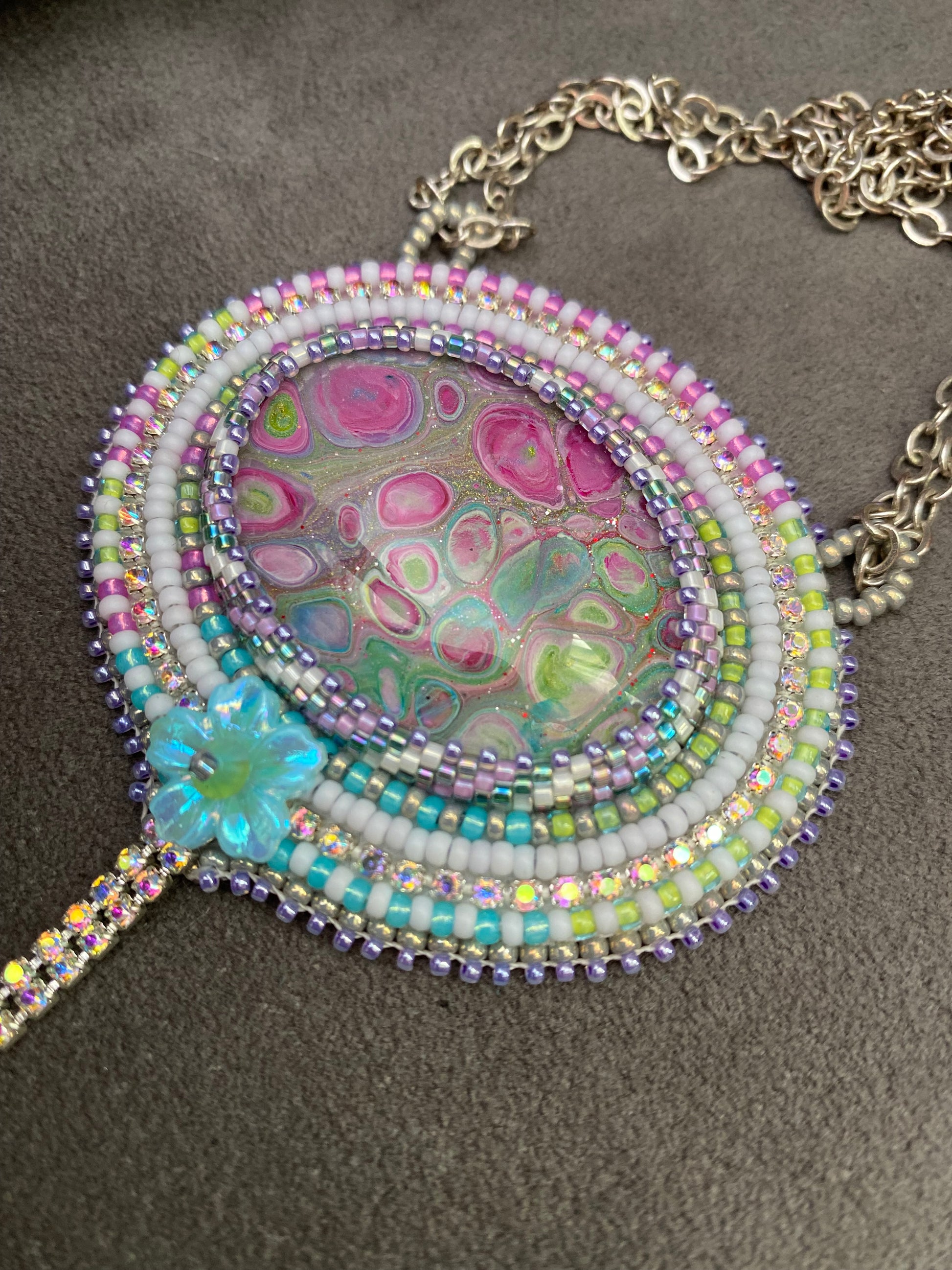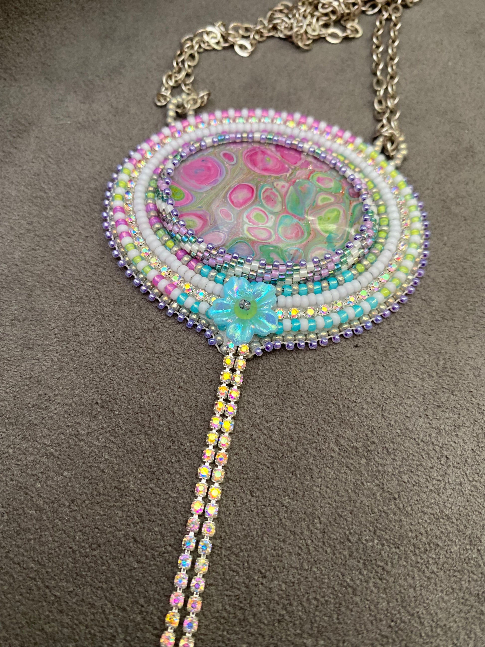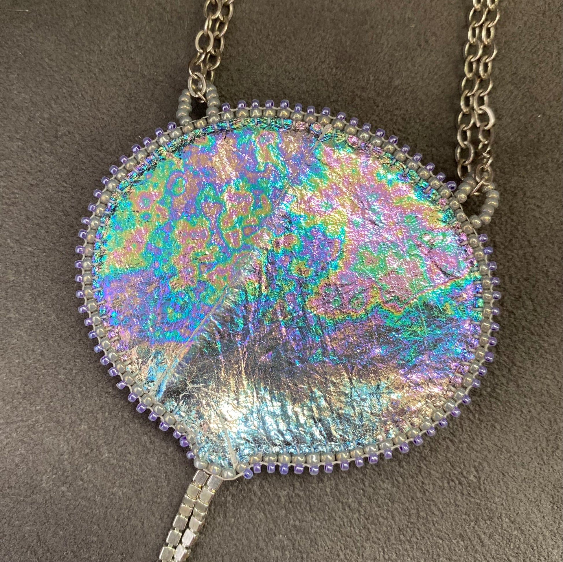 This is a one of a kind design featuring a handmade cabochon that is complimented by beads extending the color play to the edge of the pendant. A row of cupchain brings the piece to life and adds a ton of sparkle and life to the piece on top of the rainbow metallic leather on the back. This piece is strung on a 24” chain that I doubled up to take the picture but could be hung onto anything your heart desires thanks to the two loops built in.