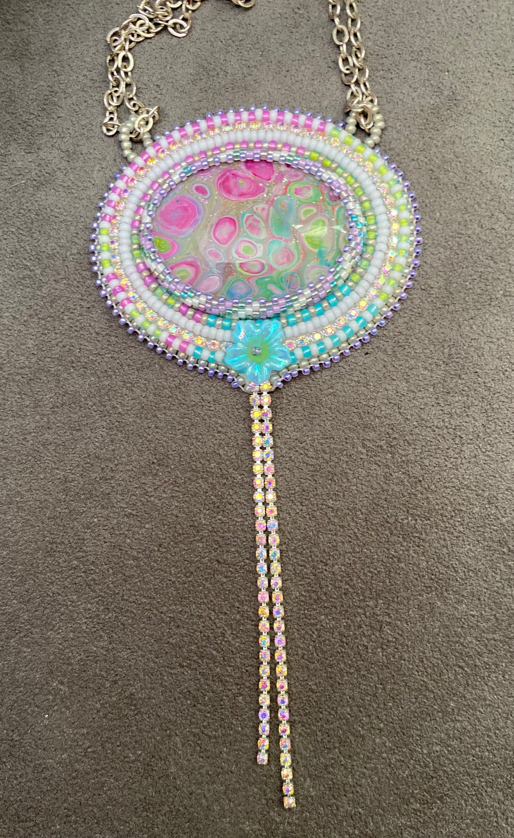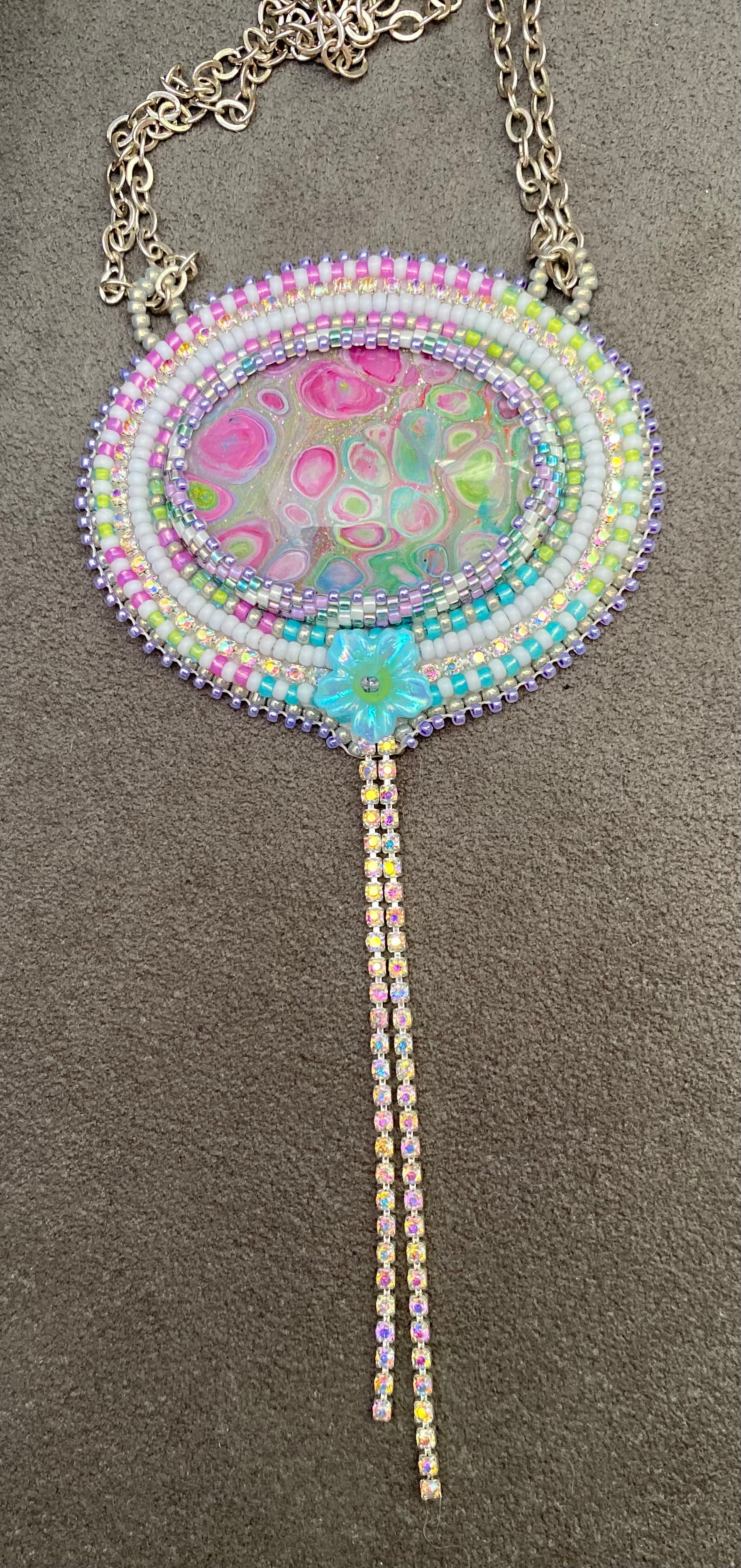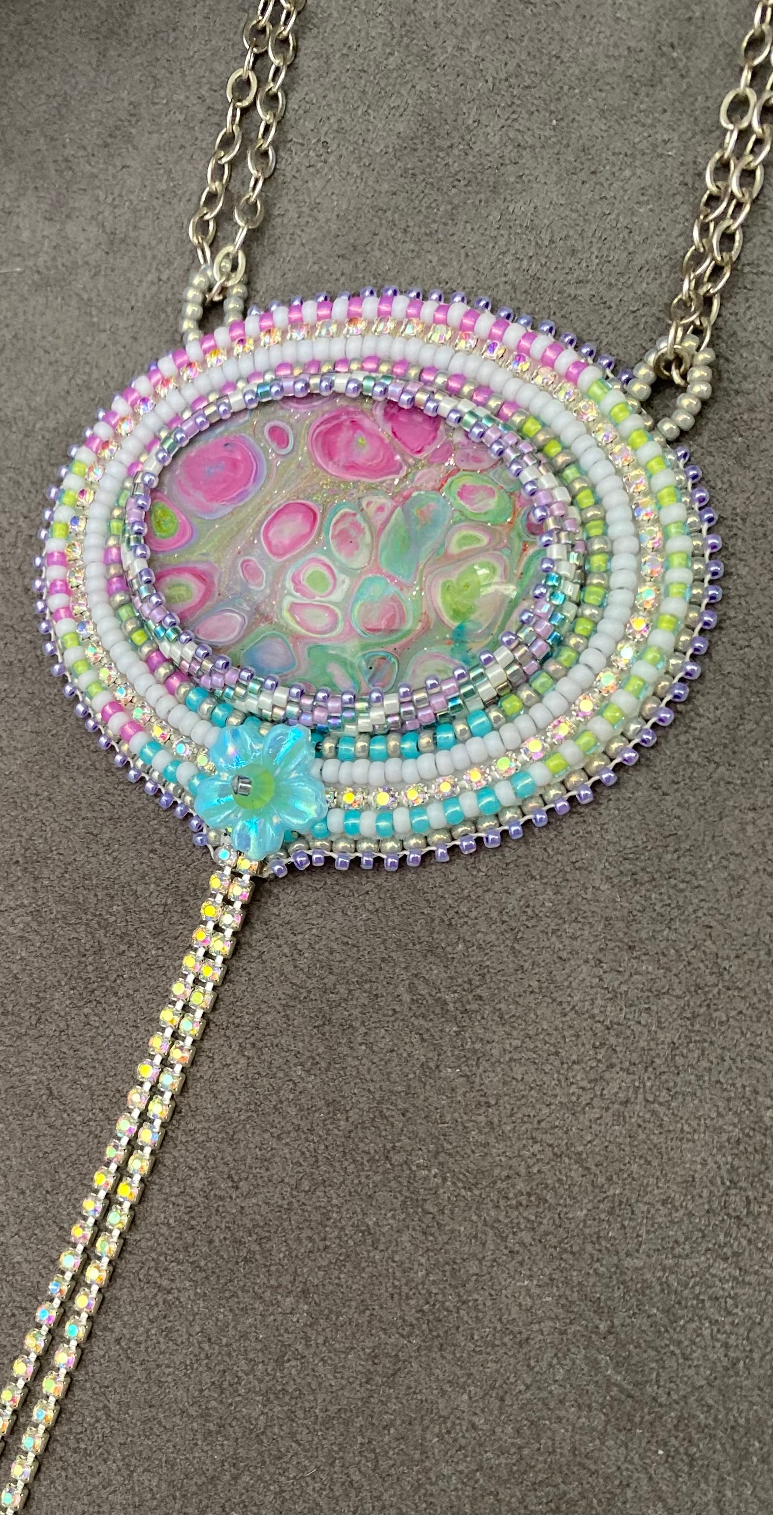 This is a one of a kind design featuring a handmade cabochon that is complimented by beads extending the color play to the edge of the pendant. A row of cupchain brings the piece to life and adds a ton of sparkle and life to the piece on top of the rainbow metallic leather on the back. This piece is strung on a 24” chain that I doubled up to take the picture but could be hung onto anything your heart desires thanks to the two loops built in.