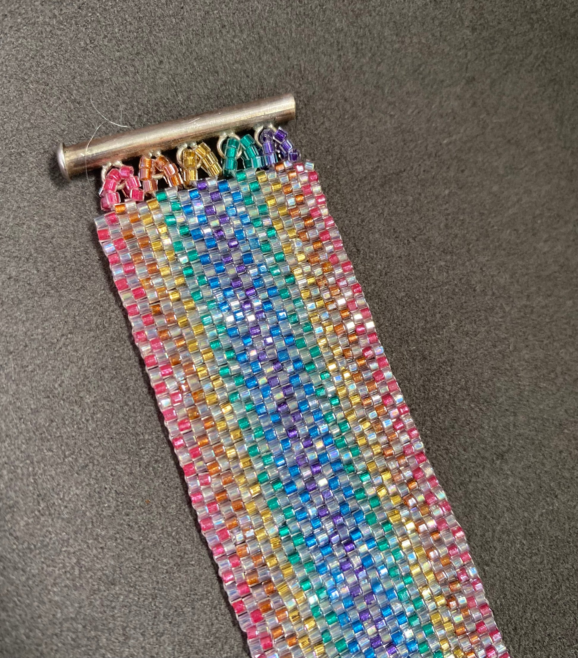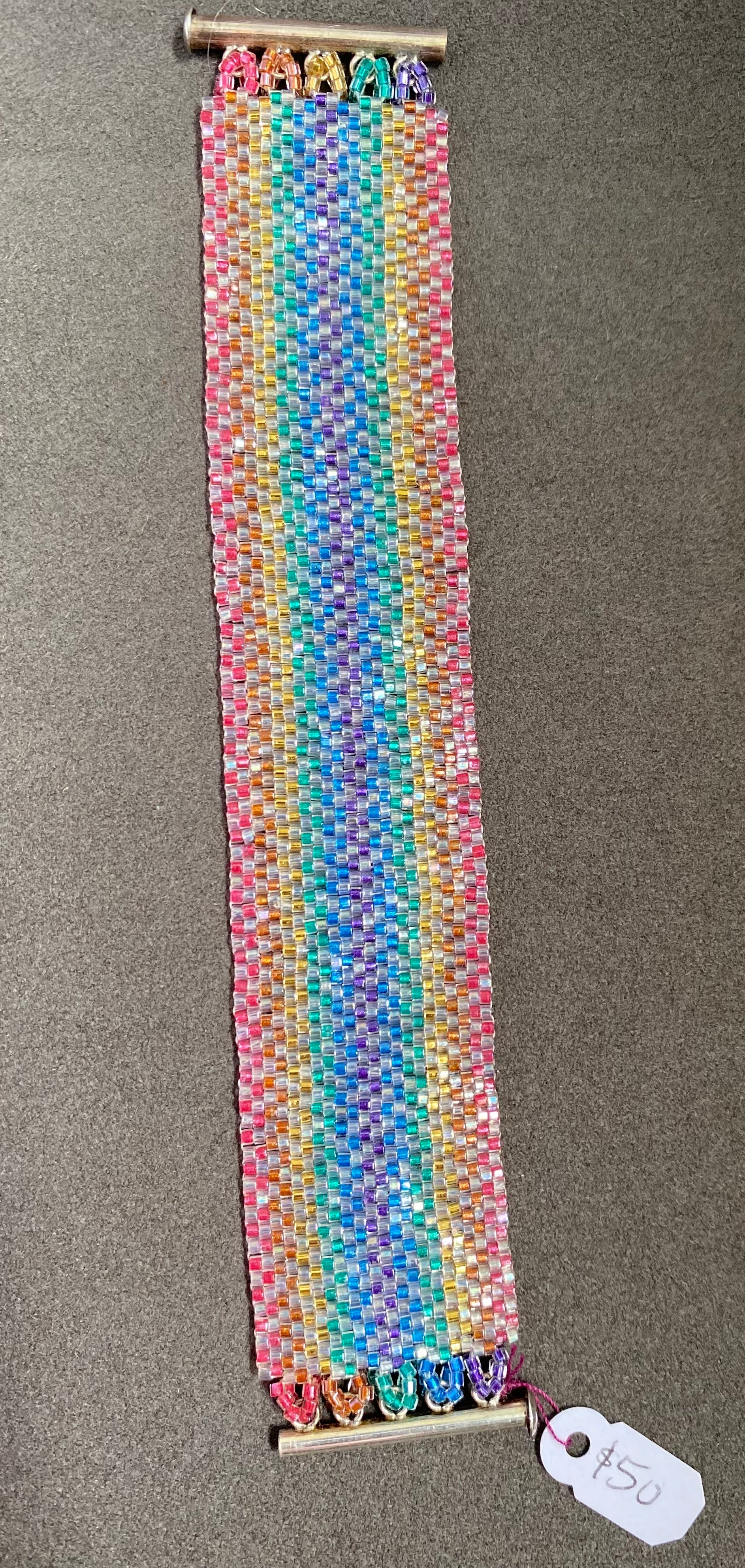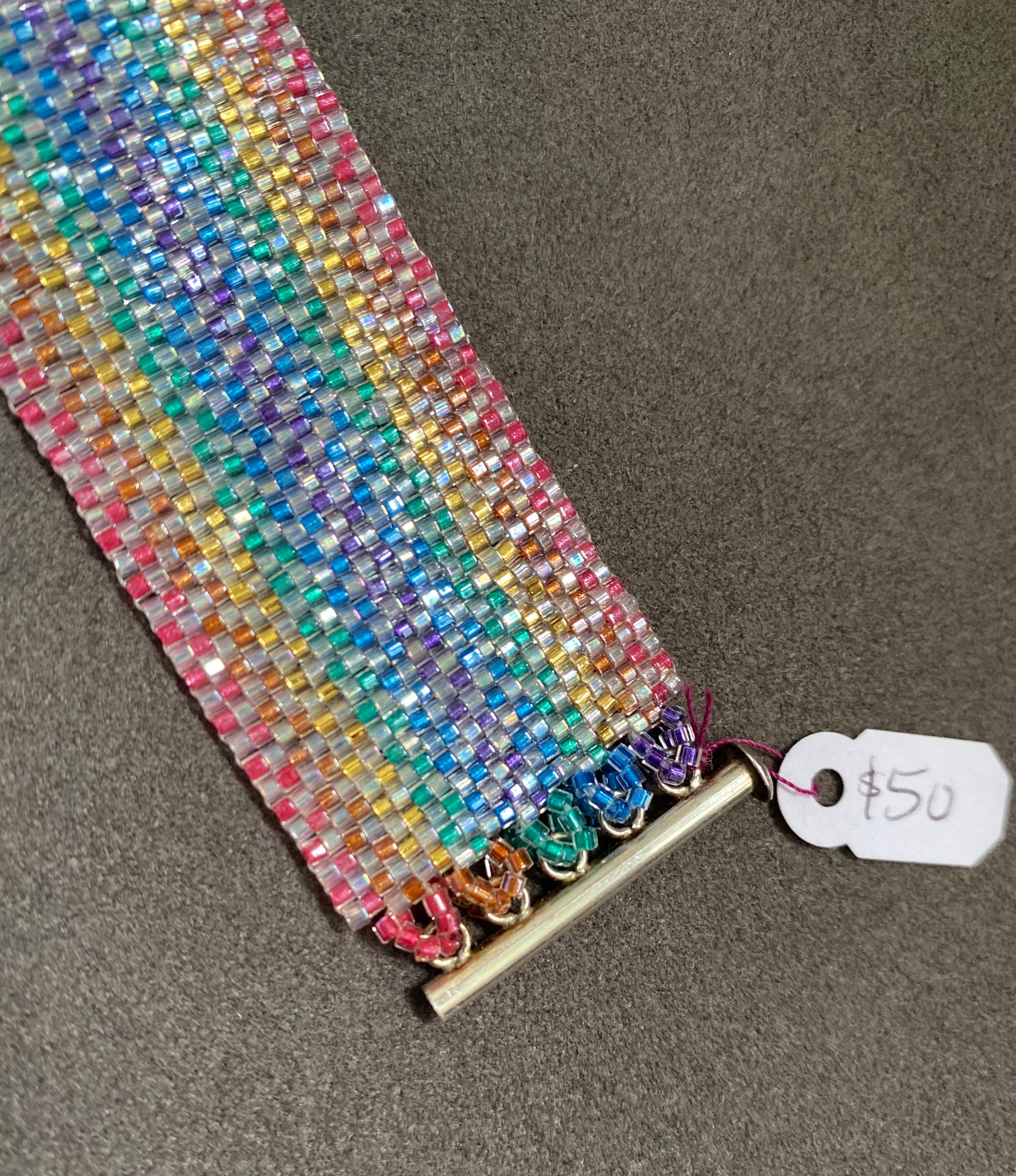 This is a peyote stitch bracelet made with rainbow delica beads. It is on the smaller side at about 6.25-6.5” featuring a sterling silver slide clasp so it will NOT fall off!
