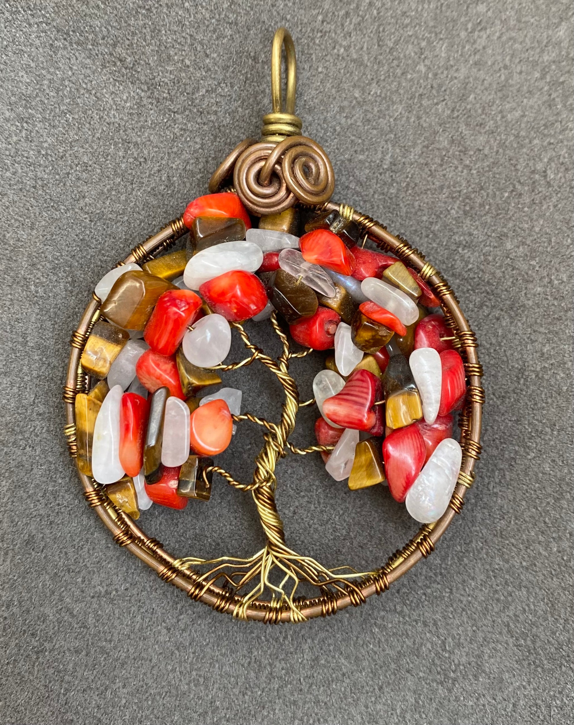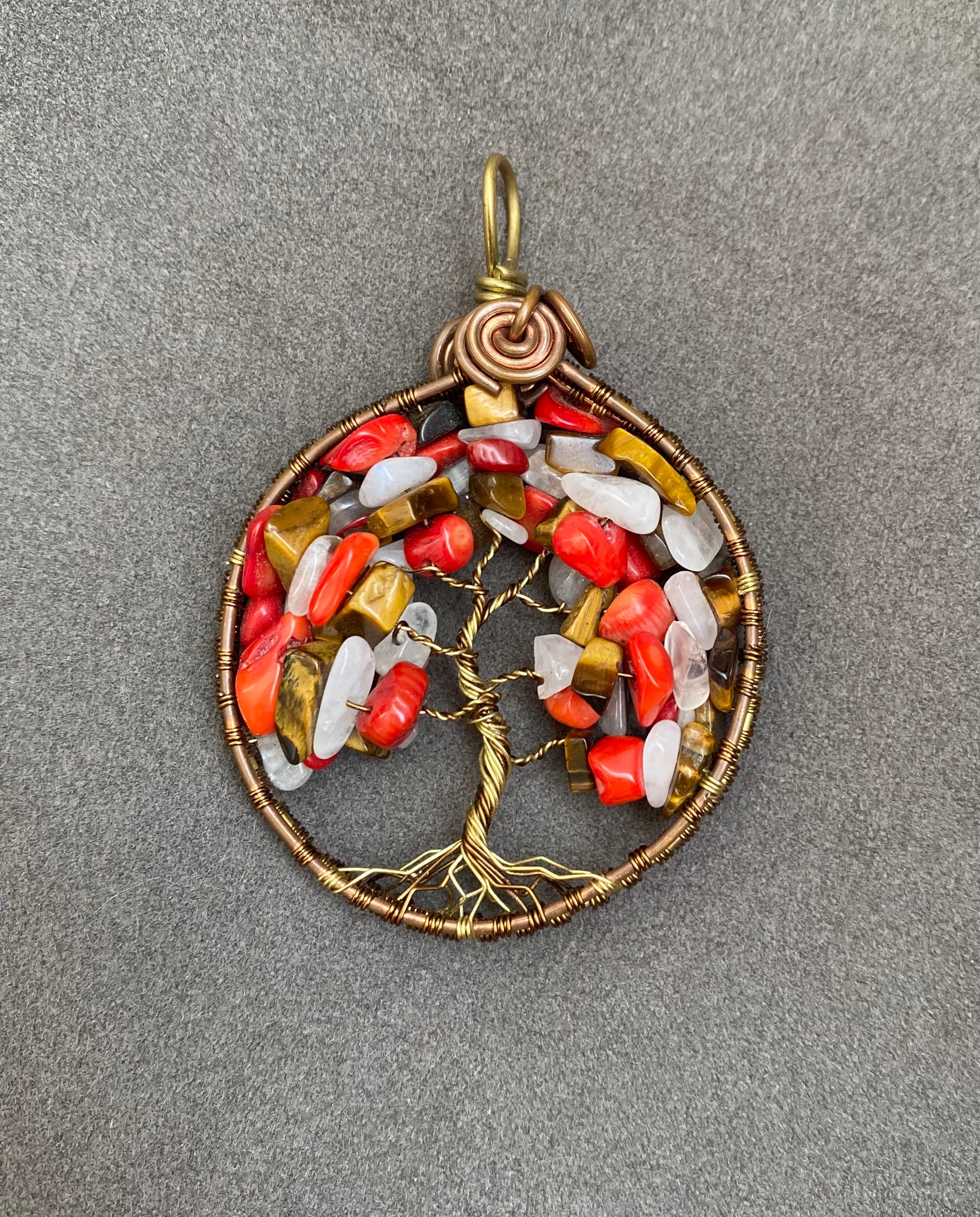 This is a one of a kind handmade item. This tree features red coral, tigers eye, and moonstone. The tree is framed in with bronze, brass, and copper wires.